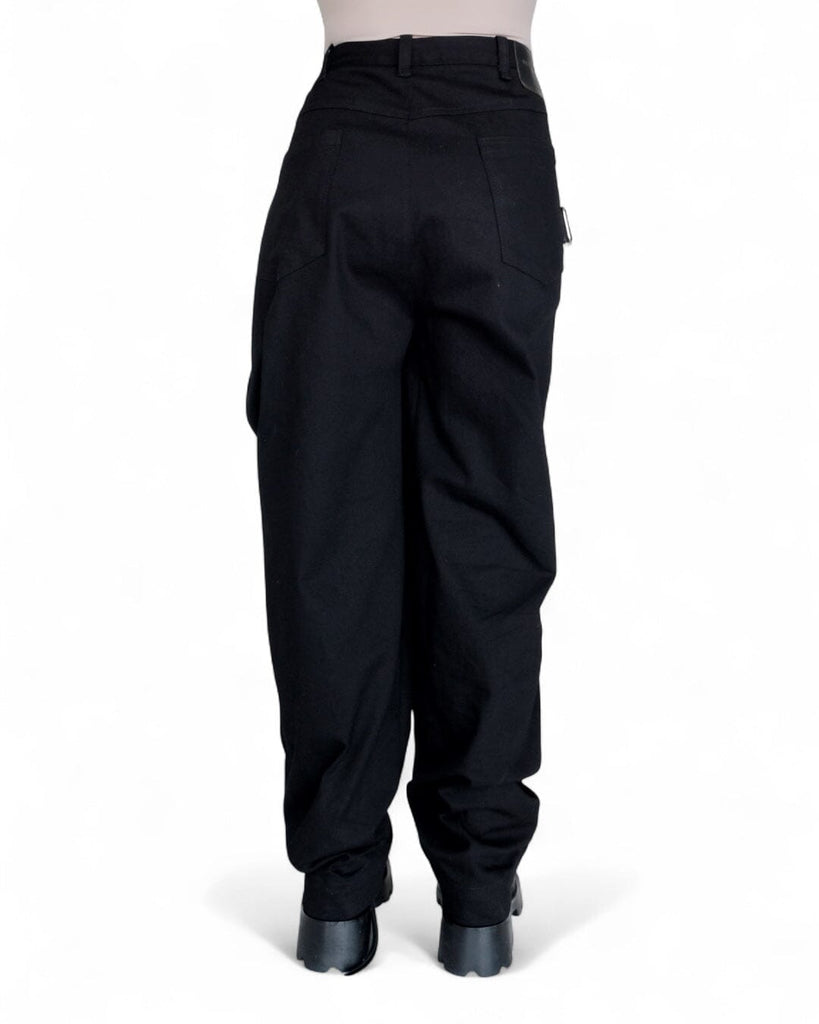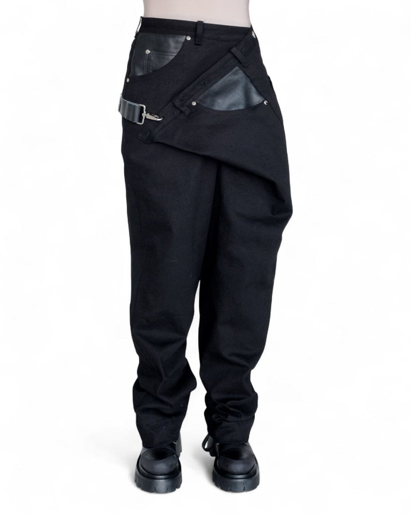 Our stretch denim trousers feature a loose fit with a cutting-edge asymmetrical cross-wrapped waist and leather patch detail. It is tailored masterfully by David’s Road.
