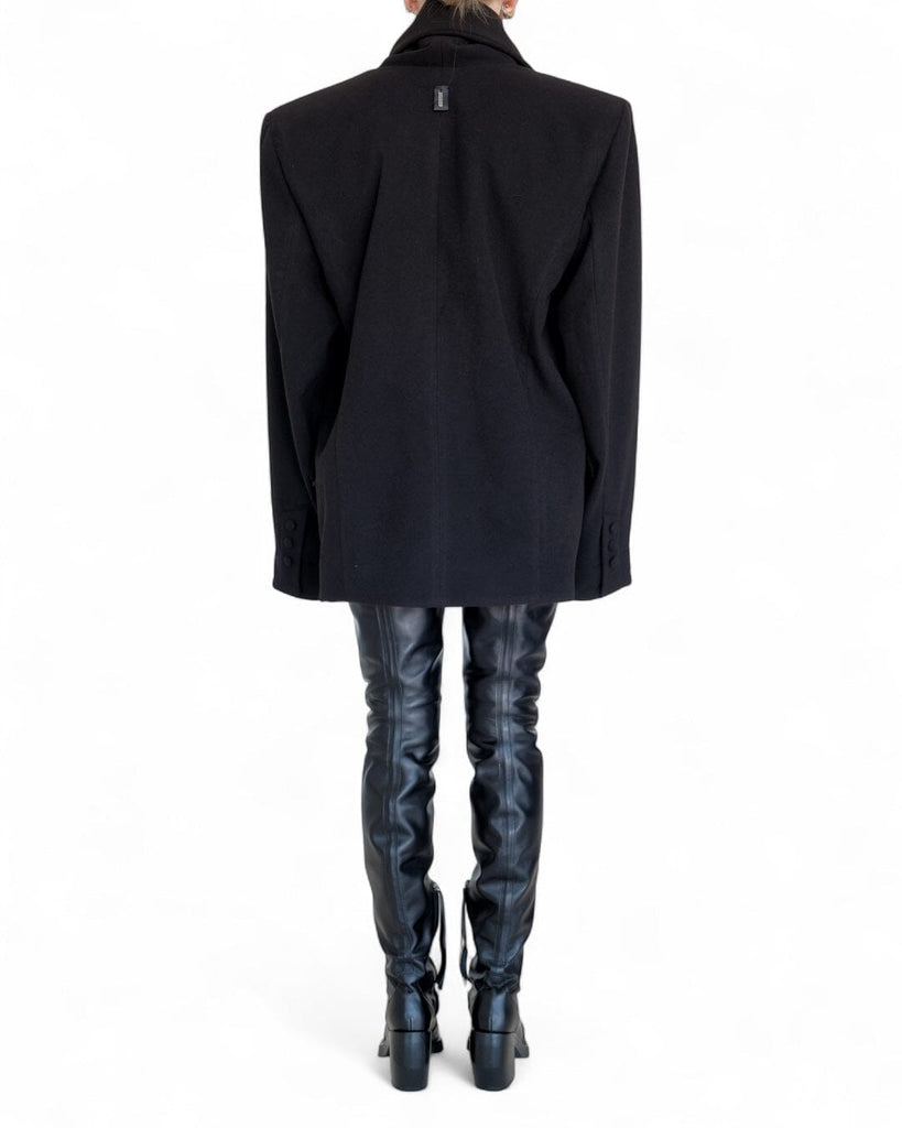 Made of fulled wool, this oversized coat with exaggerated shoulders has a v-neck lapel and long sleeves, designed by David’s Road.