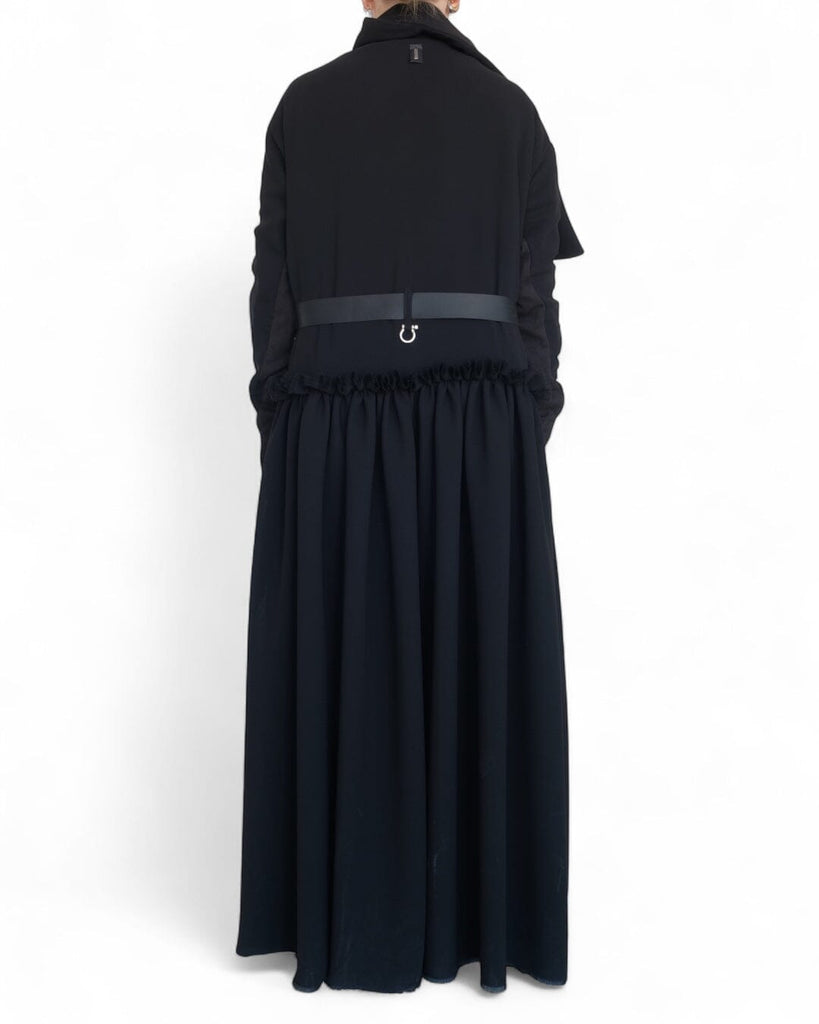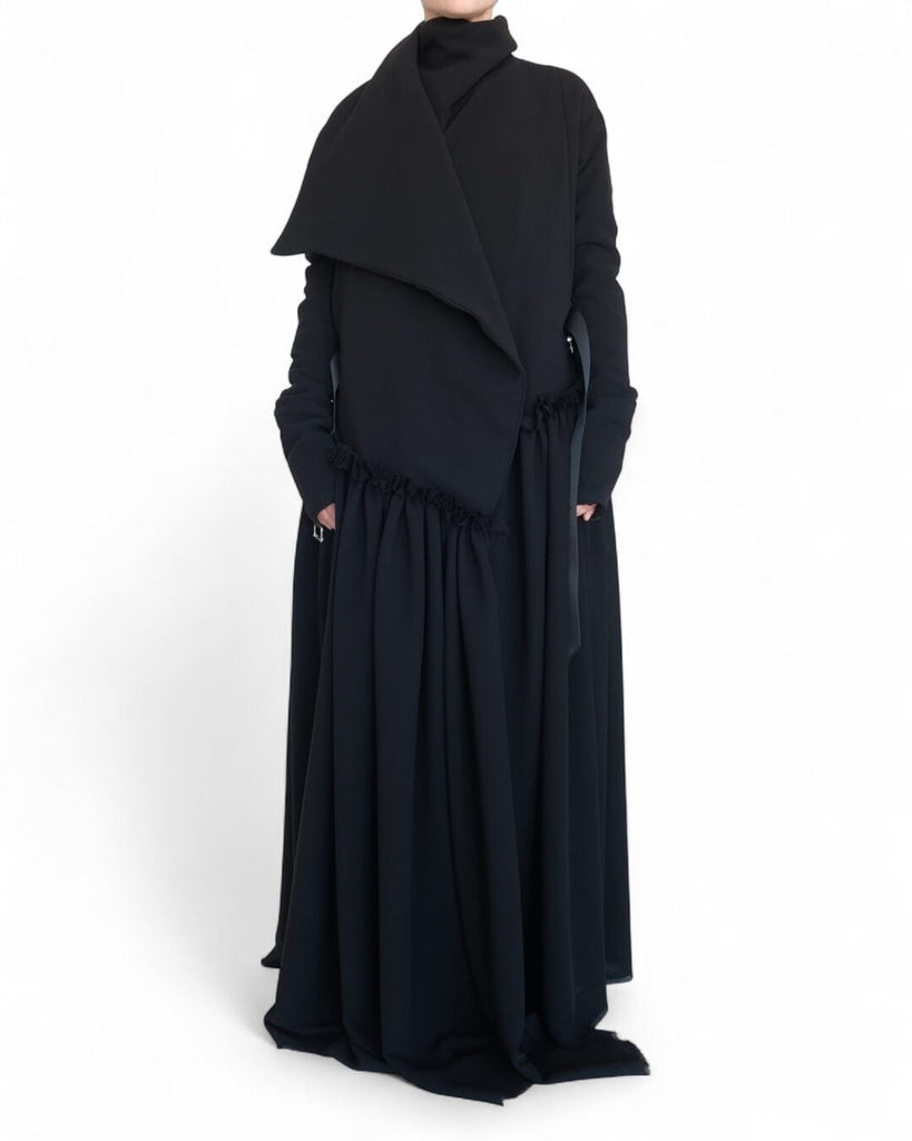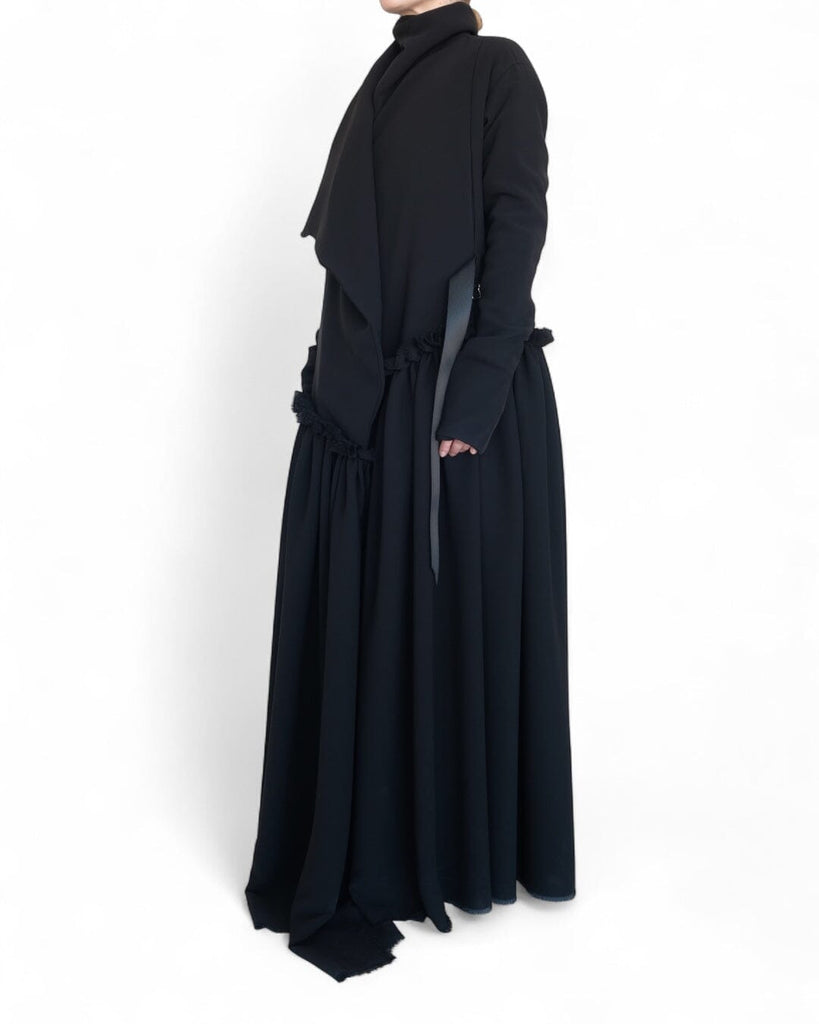 This uniquely crafted long georgette padded jacket features an asymmetrical high neckline, extra long sleeves, a belted waist and trimmed with floor length delicate ruffles, created by David’s Road.