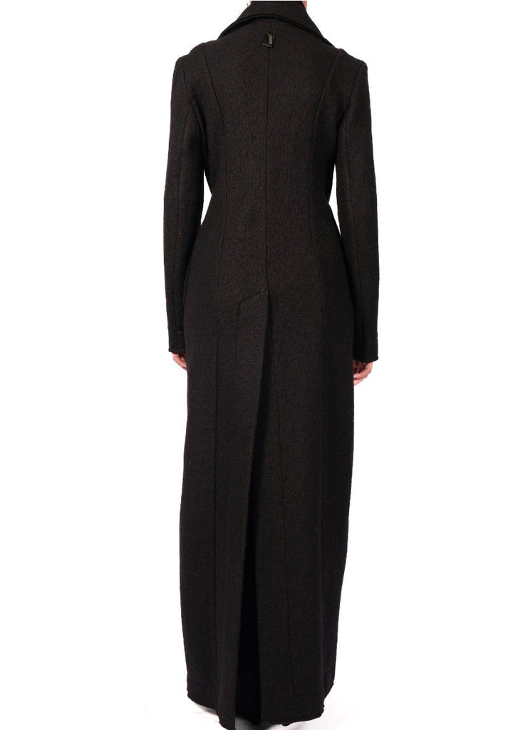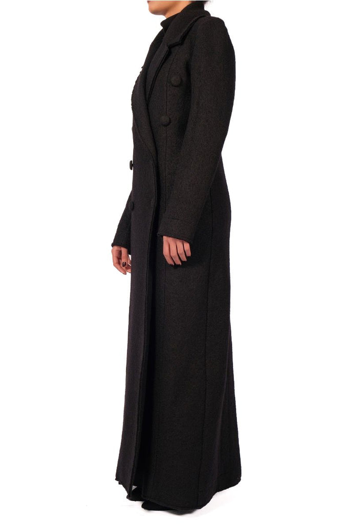 The embodiment of fashion, this wool double breasted jacket is maxi length with a fitted shape and a v neck lapel, created by David’s Road.