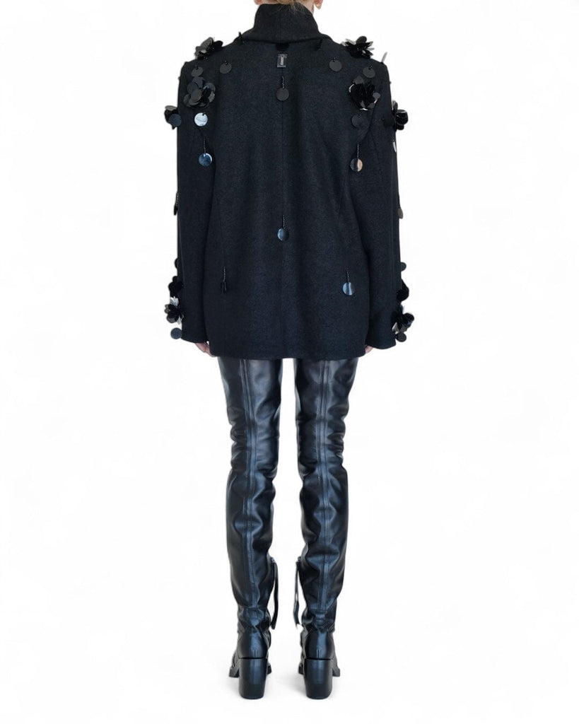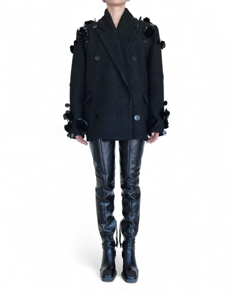 This relaxed oversized wool blazer is perfect for layering. It features a single breast button, a v-neck lapel and is adorned with circular applications, designed by David’s Road.