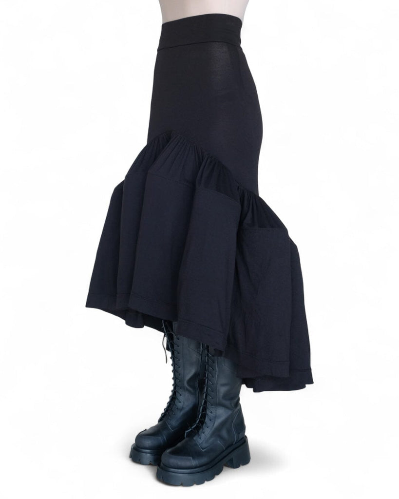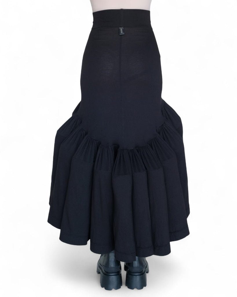 Artfully crafted, this form fitted jersey skirt puts a modern twist on Victorian ruffles which are tailored to perfection. Designed by David’s Road.