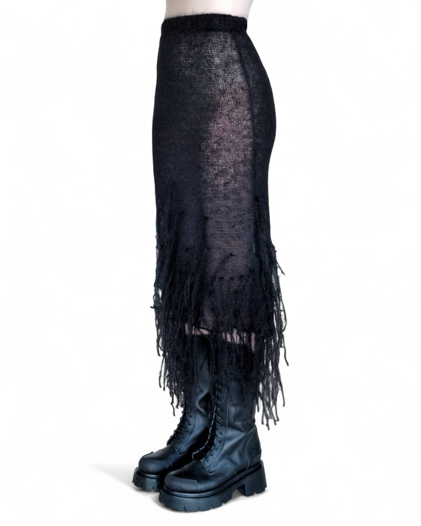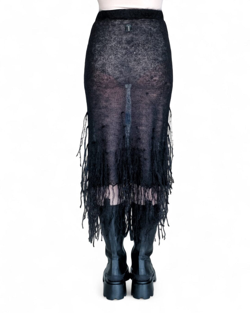 This midi length knitted skirt is sheer and finishes with fringes at the bottom, created by David’s Road.