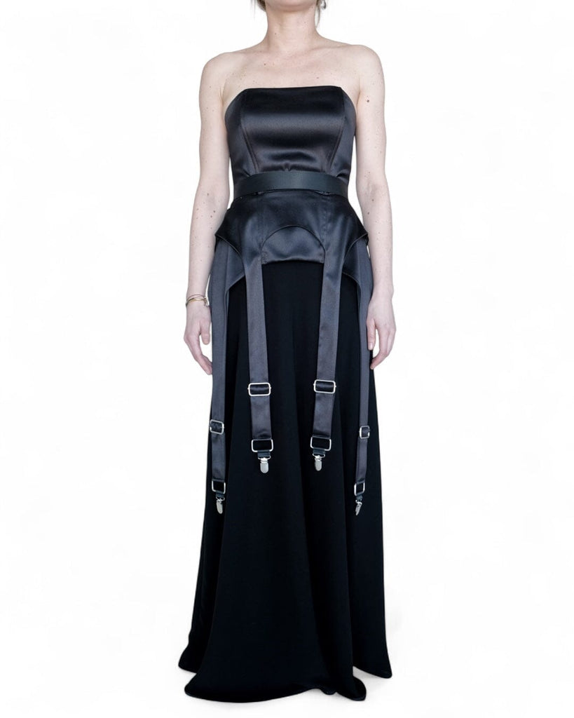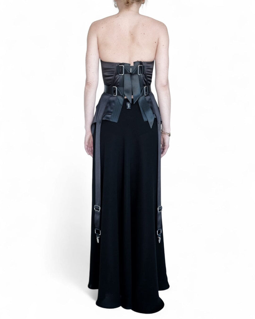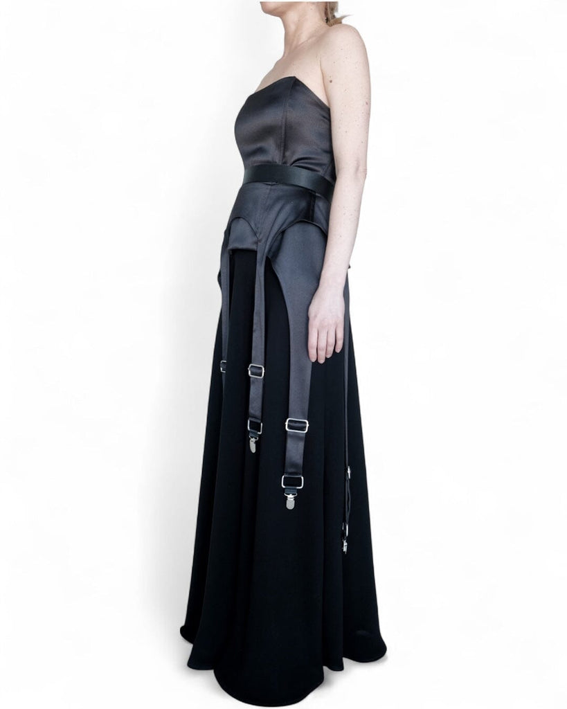 A modern adaptation, this sleek satin corset with a belted waist has a total of four clips, created by David’s Road.